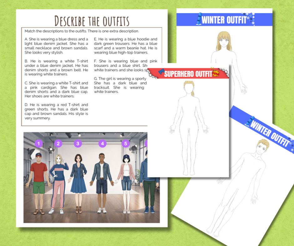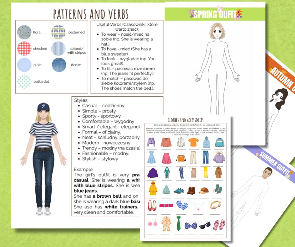 Obudź kreatywność w swoich uczniach i dzieciach! Ten zestaw to idealne narzędzie dla każdego, kto marzy o świecie mody. Zestaw zawiera przygotowane bazy (szablony) sylwetek męskich i żeńskich, które stanowią idealny fundament do tworzenia własnych kolekcji ubrań. Uczniowie nie tylko tworzą outfity, ale również wypowiedzi co ich modele mają na sobie. Używają konstrukcji Present Continuous oraz słownictwa CLOTHES AND ACCESSORIES.