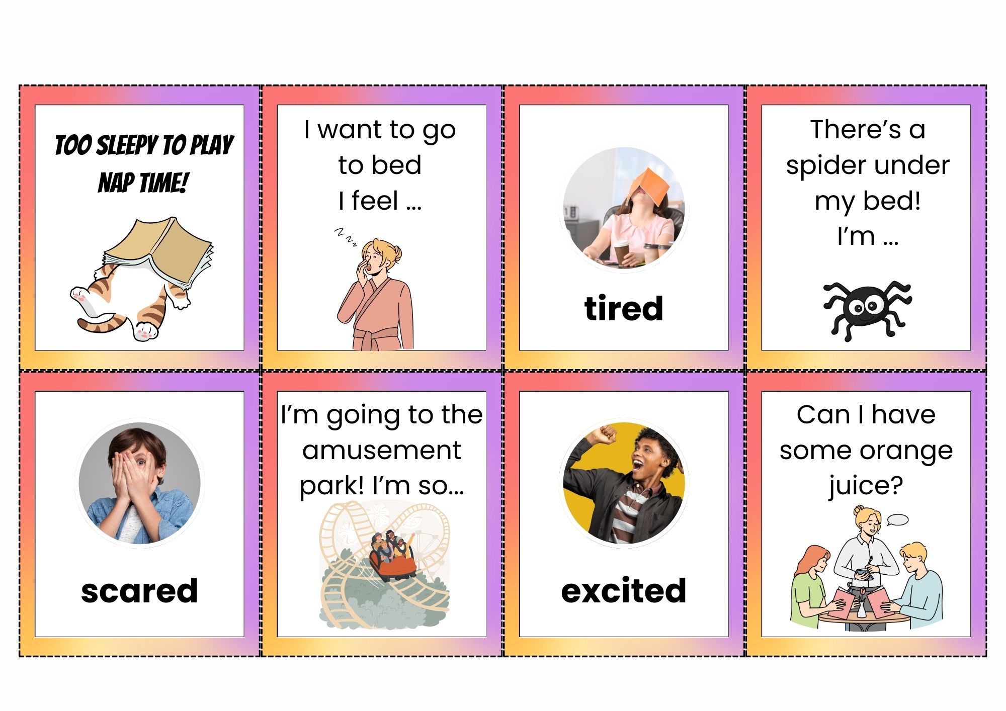 Feelings and emotions cards to zestaw 31 kart do nauki i utrwalania słownictwa związanego z emocjami w języku angielskim na poziomie A1-A2. W talii znajduje się 15 par kart - jedna z nich zawiera słowo (np. hungry, happy, nervous), a druga pasującą ilustrację lub krótką sytuację, która tę emocję przedstawia - oraz jedna karta Czarnego Piotrusia (śpiącego kota).