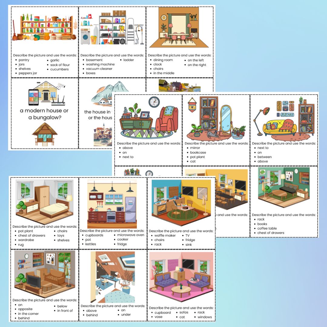 Furniture & Rooms Challenge to gra planszowa, która w atrakcyjny sposób uczy słownictwa związanego z domem i mieszkaniem. Gracze ćwiczą nazwy pomieszczeń, mebli, przedmiotów w domu oraz rodzajów budynków, a także stosowanie przyimków miejsca takich jak in, on, under, between, opposite, next to, behind, above.