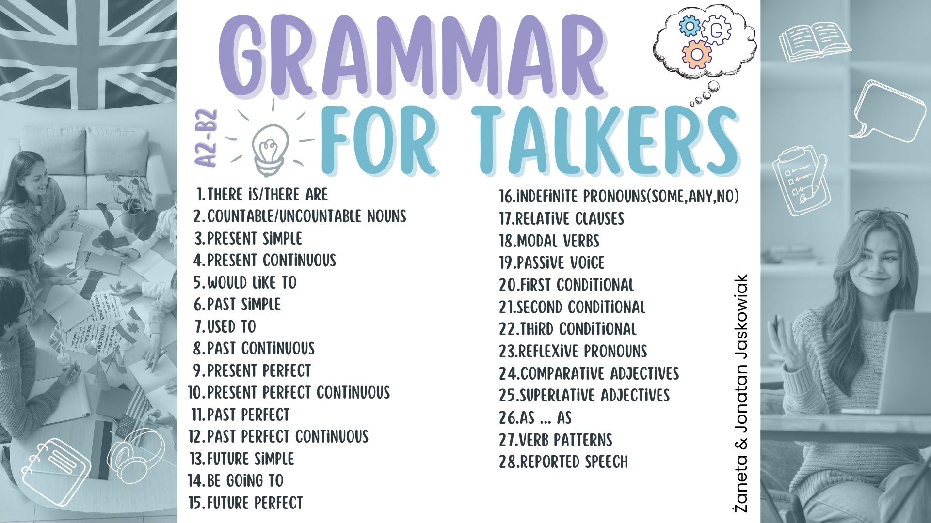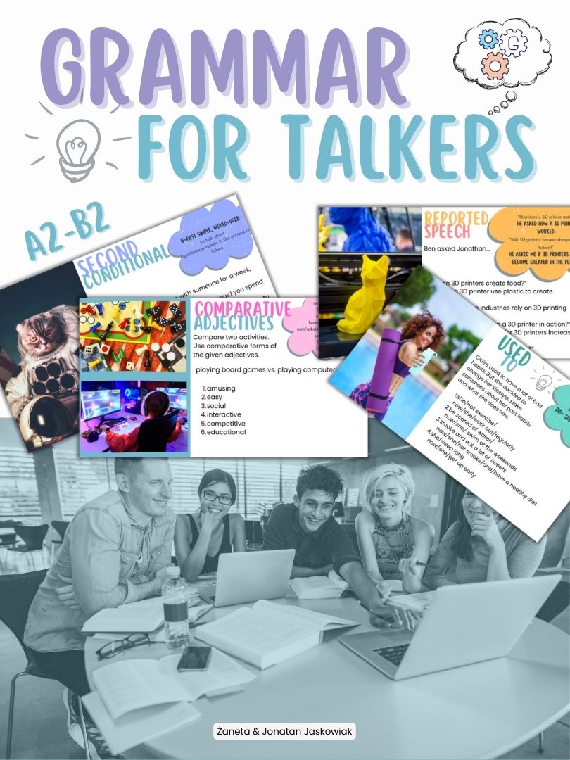 Grammar for Talkers to bogaty zestaw 130 stron materiałów do nauki i utrwalania gramatyki angielskiej na poziomie A2–B2 w formie rozmów, zachęcający do swobodnej konwersacji na codzienne tematy. Każda strona opiera się na konkretnym zagadnieniu gramatycznym i angażuje ucznia w praktyczne odpowiadanie na pytania oparte na obrazkach lub jego własnych doświadczeniach.