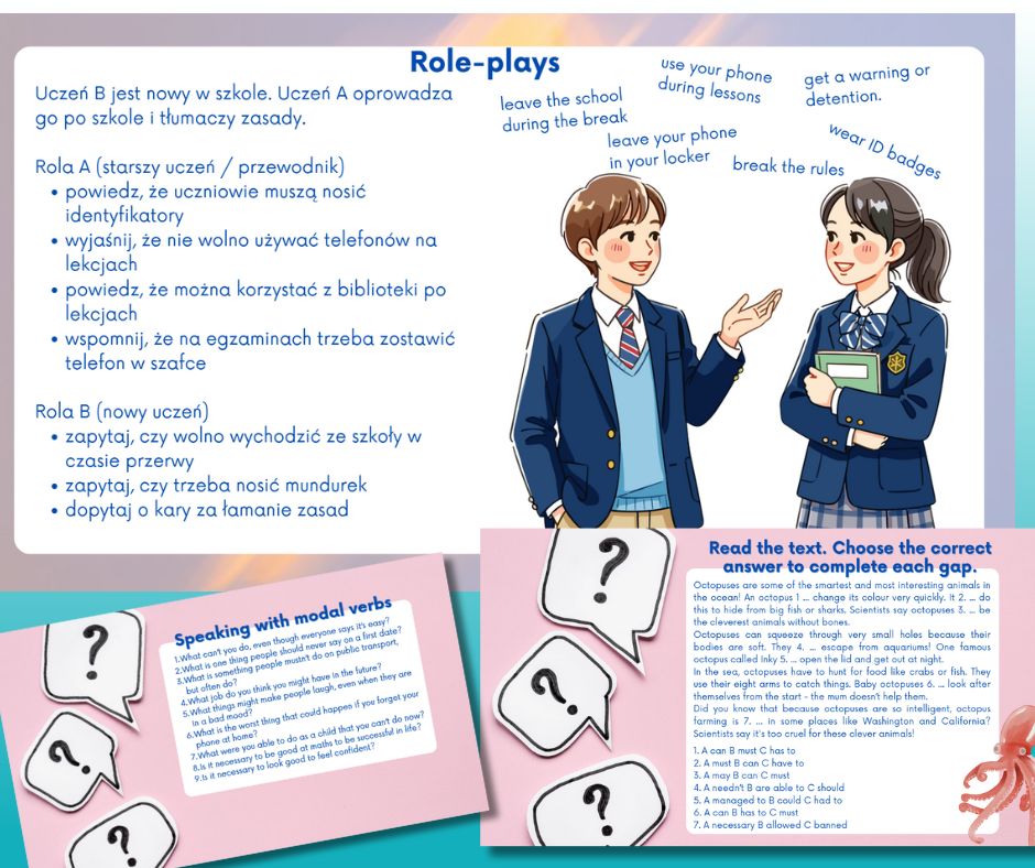 👉 Część 2 (B1–C1) 24 strony, została przygotowana z myślą o maturze: obejmuje nie tylko czasowniki modalne, ale także zaawansowane wyrażenia o tym samym znaczeniu (modal equivalents), oraz zaawansowane wyrażenia idiomatyczne, niezbędne na wyższym poziomie.