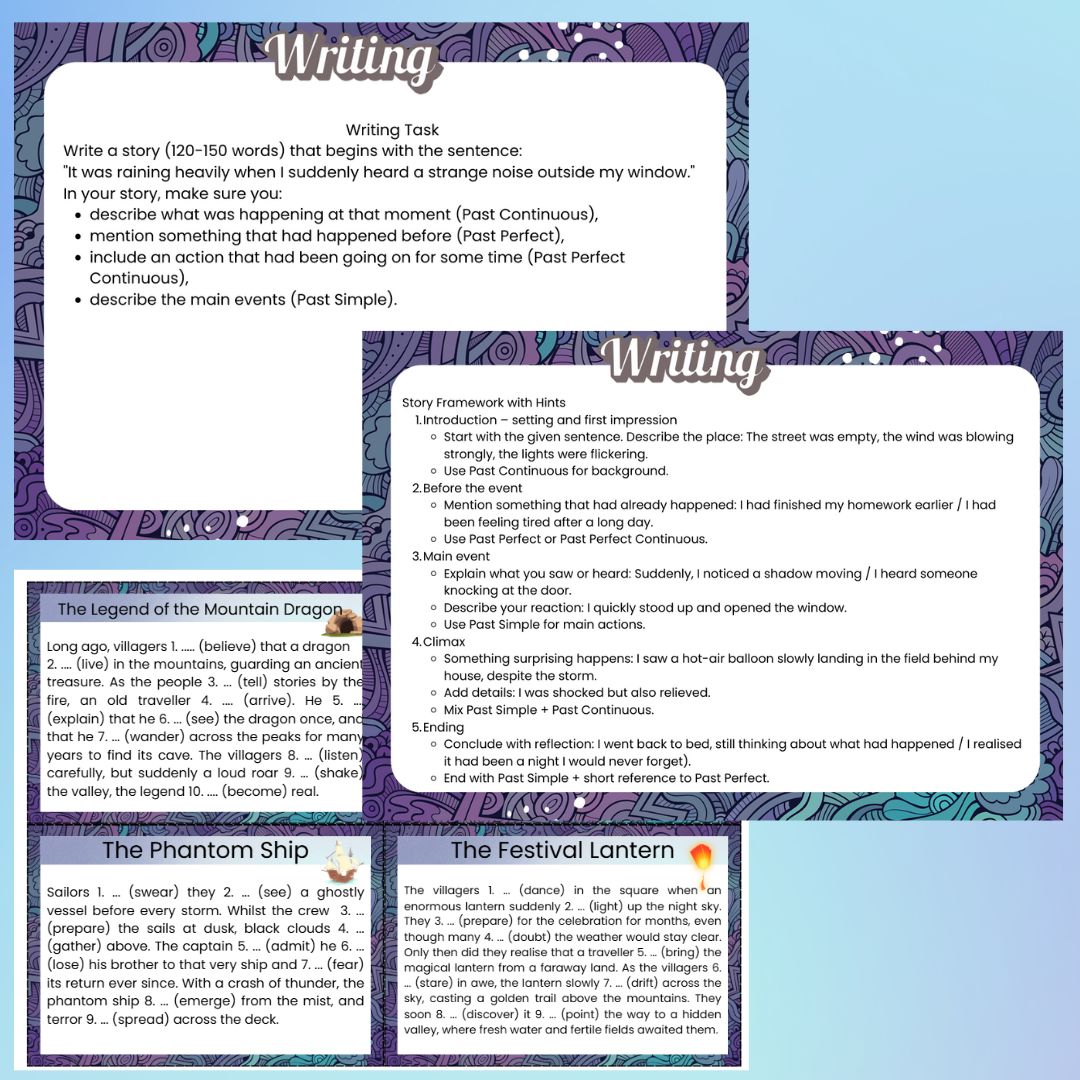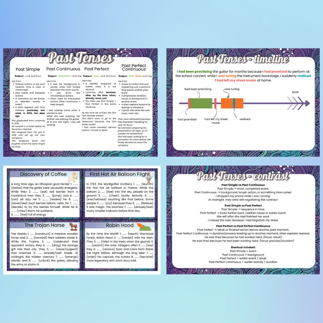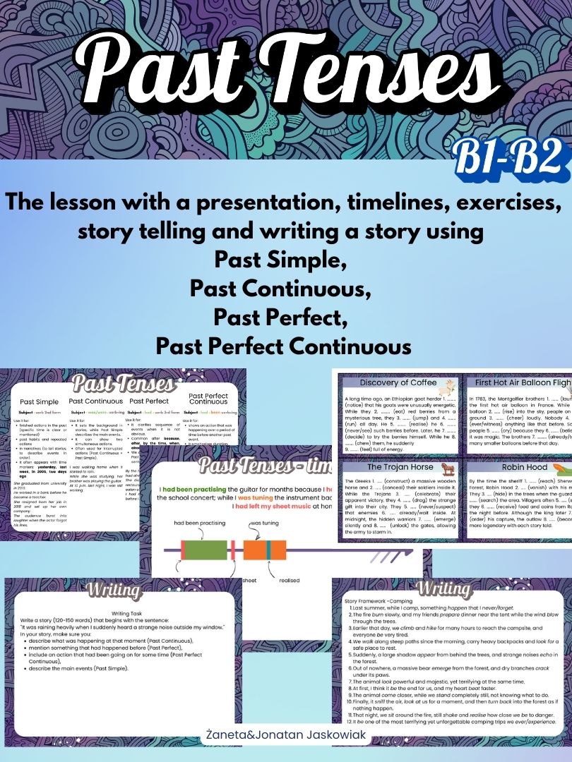 Past Tenses - Lesson & Presentation to 21-stronicowa prezentacja z gotową lekcją, która w praktyczny i angażujący sposób pomaga uczniom powtórzyć wszystkie narrative tenses (Past Simple, Past Continuous, Past Perfect, Past Perfect Continuous), na poziomie B1-B2.