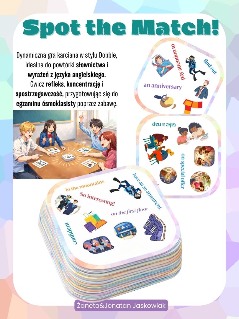 Spot the Match to dynamiczna gra karciana w formacie PDF, inspirowana zasadami popularnej gry Dobble. Została stworzona z myślą o uczniach klasy ósmej jako skuteczne i angażujące narzędzie do powtórki słownictwa i wyrażeń wymaganych na egzaminie ósmoklasisty z języka angielskiego.
