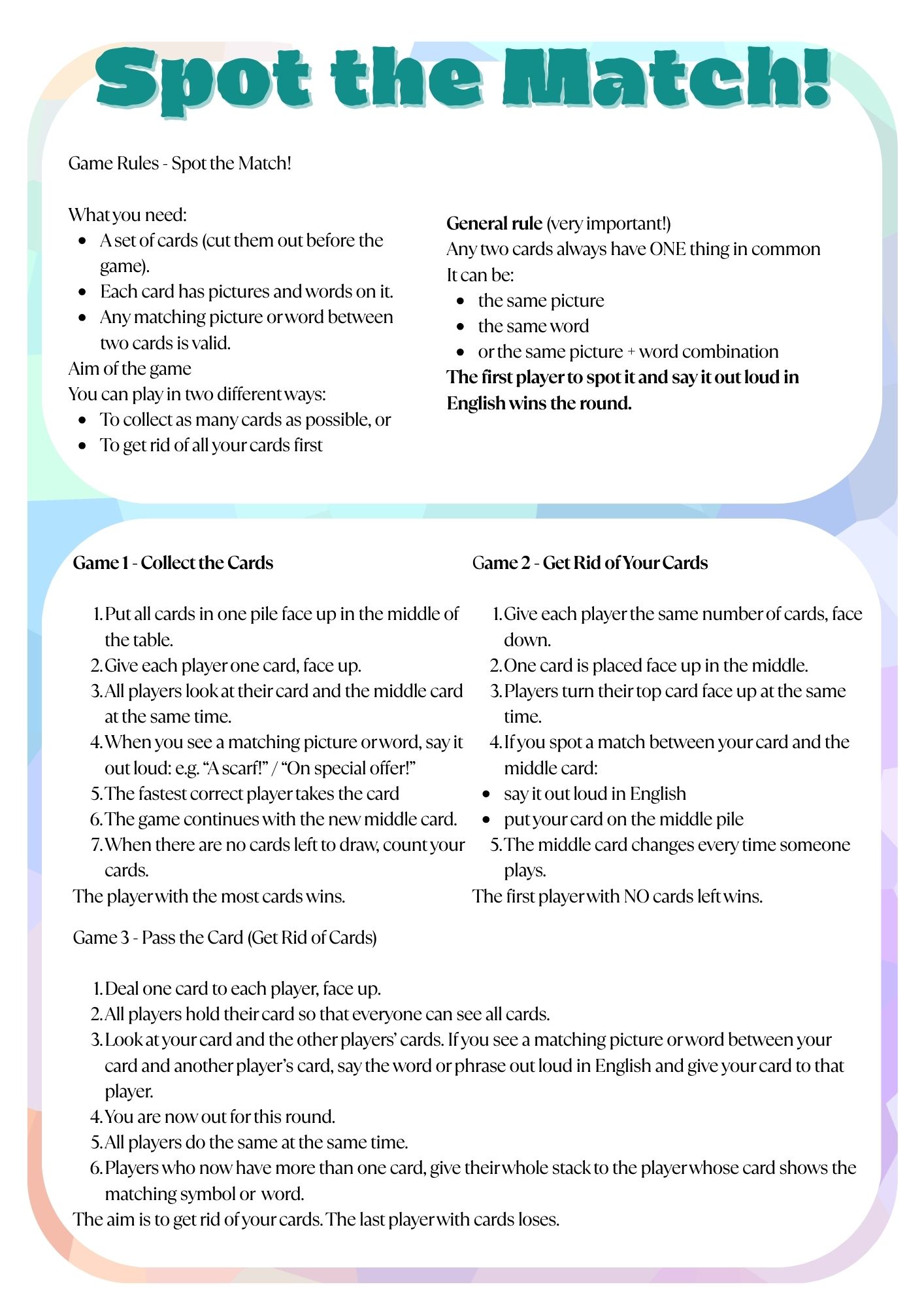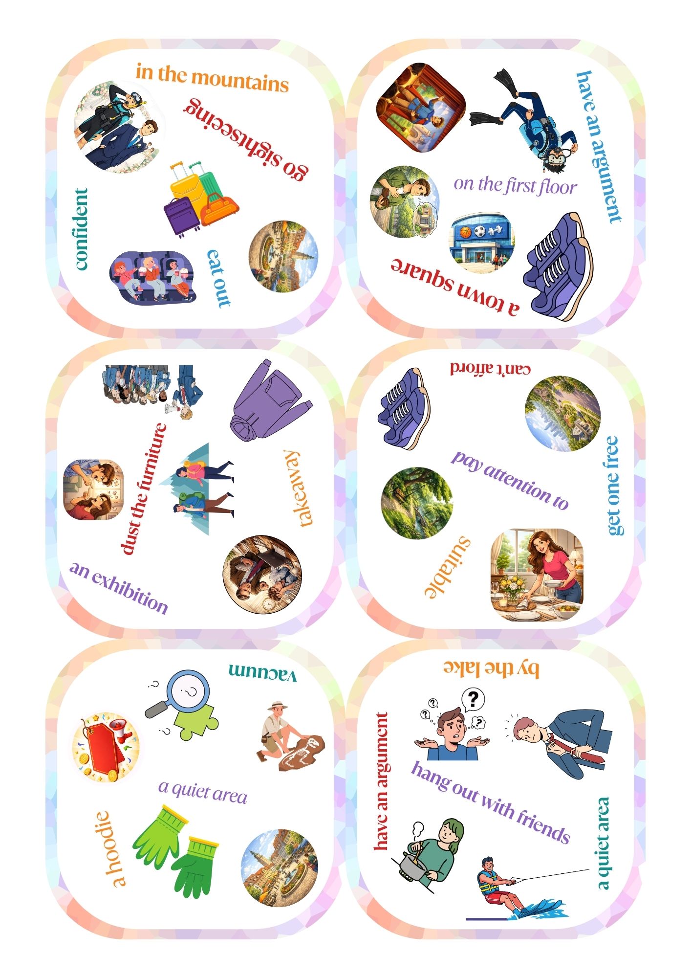 Każde dwie karty mają dokładnie jeden wspólny element - słowo, wyrażenie lub ilustrację. Zadaniem uczniów jest jak najszybsze odnalezienie tego elementu i nazwanie go poprawnie po angielsku. Przykładowe słowa i wyrażenia: can't afford, famous for, confident, on the outskirts, a quiet area, luggage, eat out, hang out with friends.. itd.